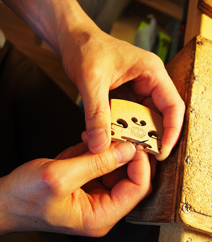 これは弓で弦に圧力をかけたり調弦することによって弦の摩擦でだんだん指板側へ傾いてきているのですが、あまりひどく折れ曲がってくると倒れたり割れたりする可能性があります。いつも注意をしておく必要がありますが、特に弦を新しく張り替えた時などは頻繁にチェックして直すようにしましょう。