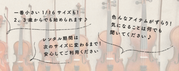 お子様にバイオリンのレッスンをご希望の方には、子供用サイズ(分数バイオリン)のレンタルもご用意しています。