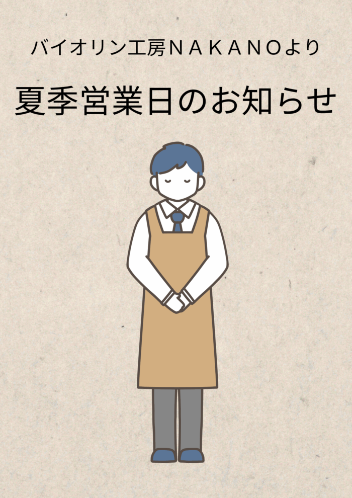夏季休業日のお知らせ 2025-08-09 最終更新日時 : 2025-11-02 violin-nakano 夏季休業日は8月13日(水)から17日(日)までとさせていただきます。 18日(月)より通常営業いたします。 \ 最新情報をチェック /
