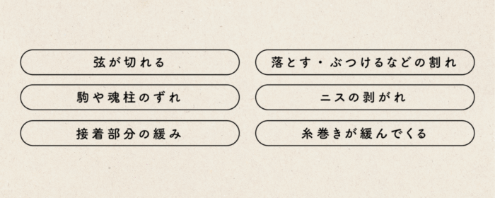 - 弦楽器の取り扱いや修理は専門の知識が必要。個人だけでなく楽器店からも依頼あり。